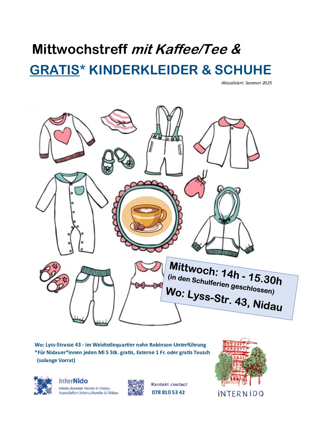Jeden Mittwoch von 14.00-15.30h findet die Kinderkleiderbörse und ein Gesprächstreff statt. Sie können entweder Kleider und Schuhe gratis tauschen oder jedes Stück für 1 CHF kaufen (Nidauer*innen beziehen bis 5 Kleidungsstücke gratis). Nebenbei können Sie bei uns einen Kaffee trinken und ein gemütliches Gespräch mit unserem Team führen. Wir freuen uns auf Sie!…
